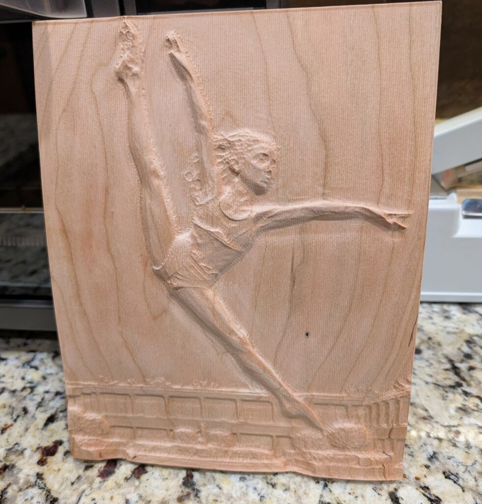CLAIRE DANCING – 1/20026 – I made this carving of my 10 year old Granddaughter, Claire. She is an amazing dancer, it almost looks like she can fly. It was made using the photograph of her leaping. A photo can be uploaded to the “Vectric” software which then calculates the toolpath necessary for the CNC Router to carve. A carving such as this takes about 15 hours of machine time to complete.
