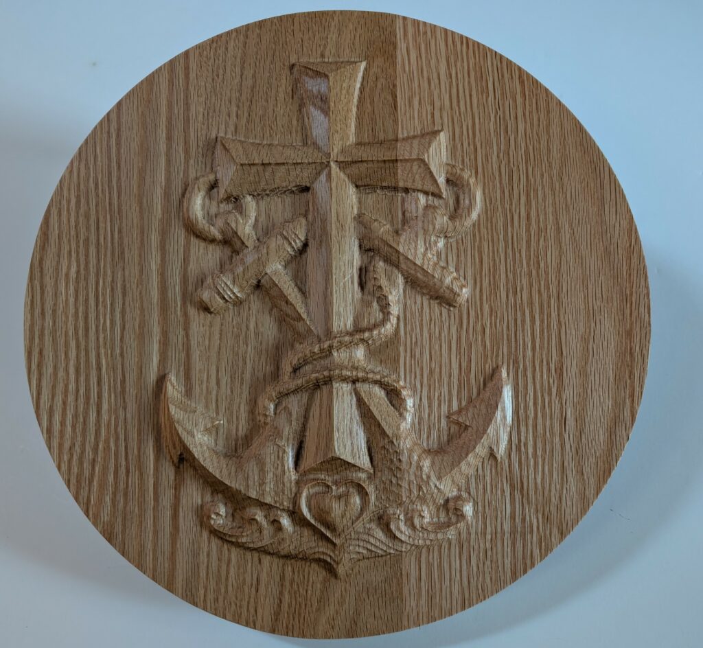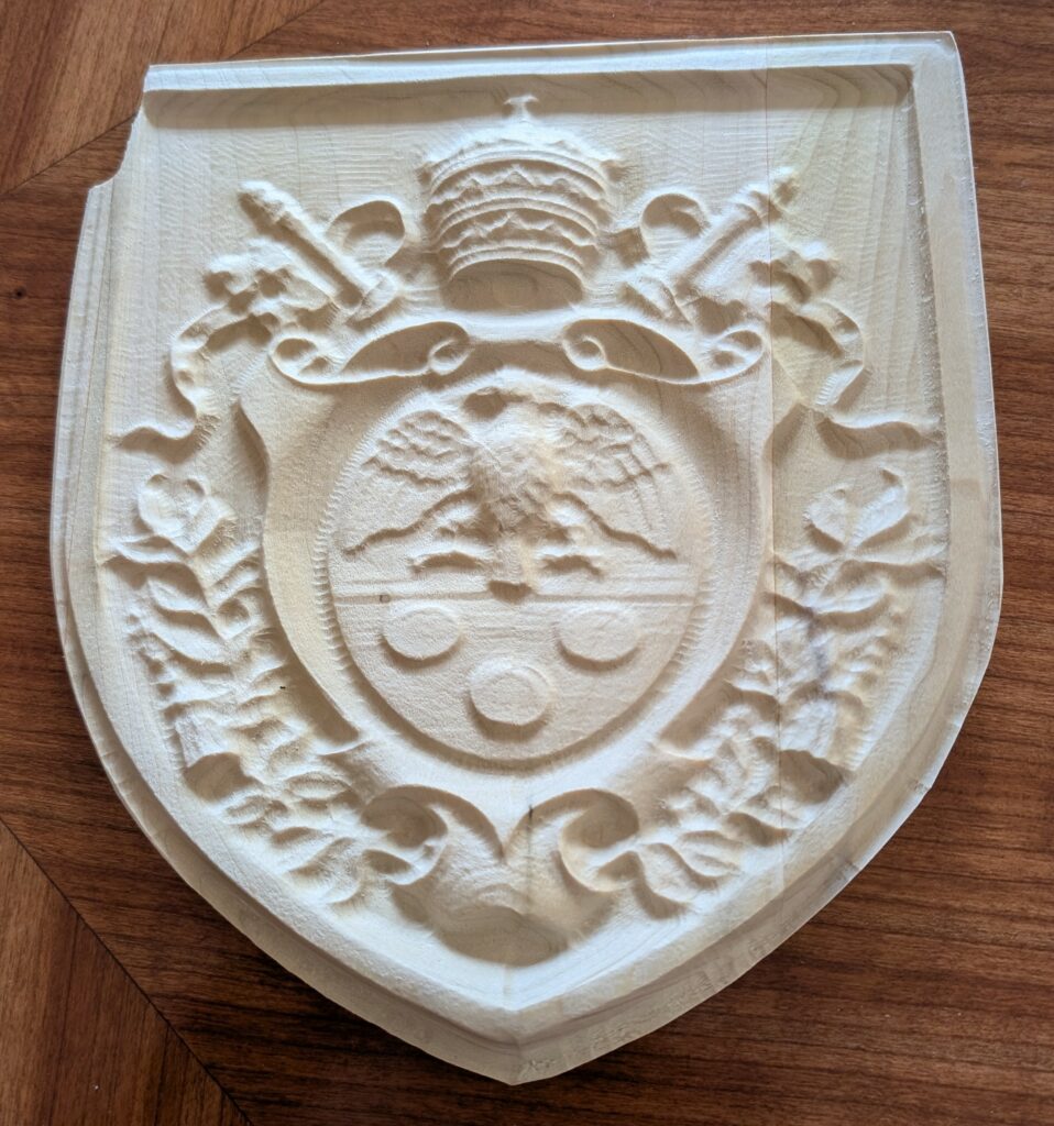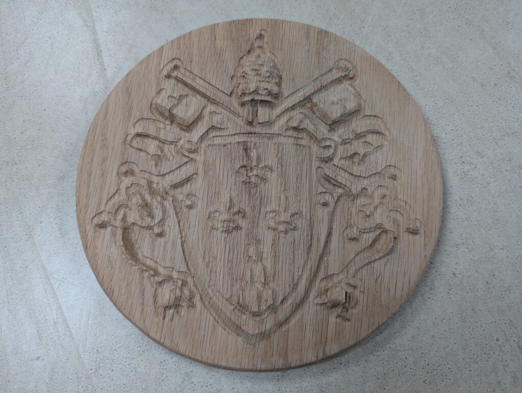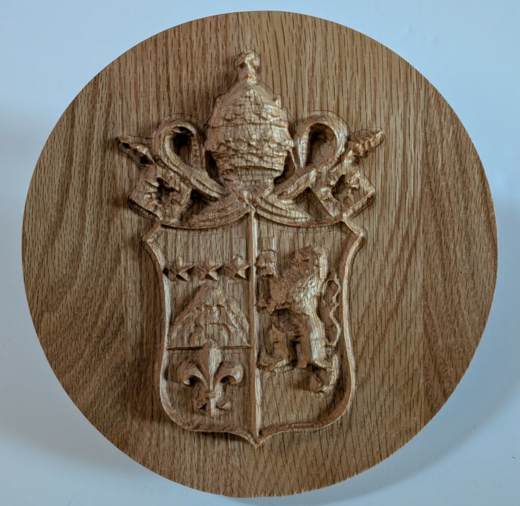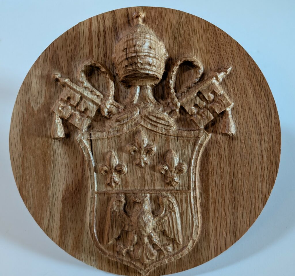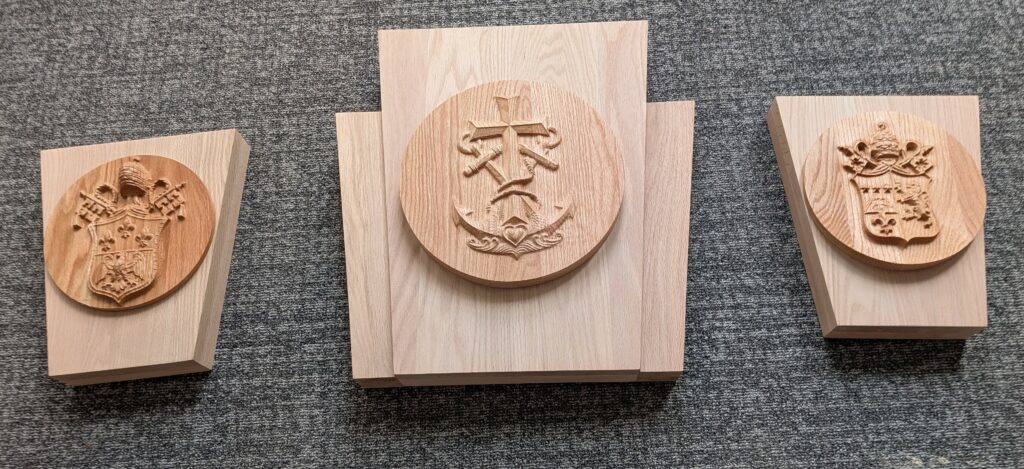 PAPAL COATS OF ARMS – 2/2026 – Christ the King Catholic Church in Missoula, MT is undergoing a complete renovation of it’s Worship Space. Three arched porticoes have been constructed for the Main Altar and the two Side Altars. I was asked to create these red oak keystones and carvings to place in the center of each arch. The keystone in the center arch features a carving of the Christian symbol, the Cross and Anchors. The keystones in the left and right arches feature carvings of the Coats of Arms of Pope Paul VI and Pope Pius XI. The other two carvings were test pieces.