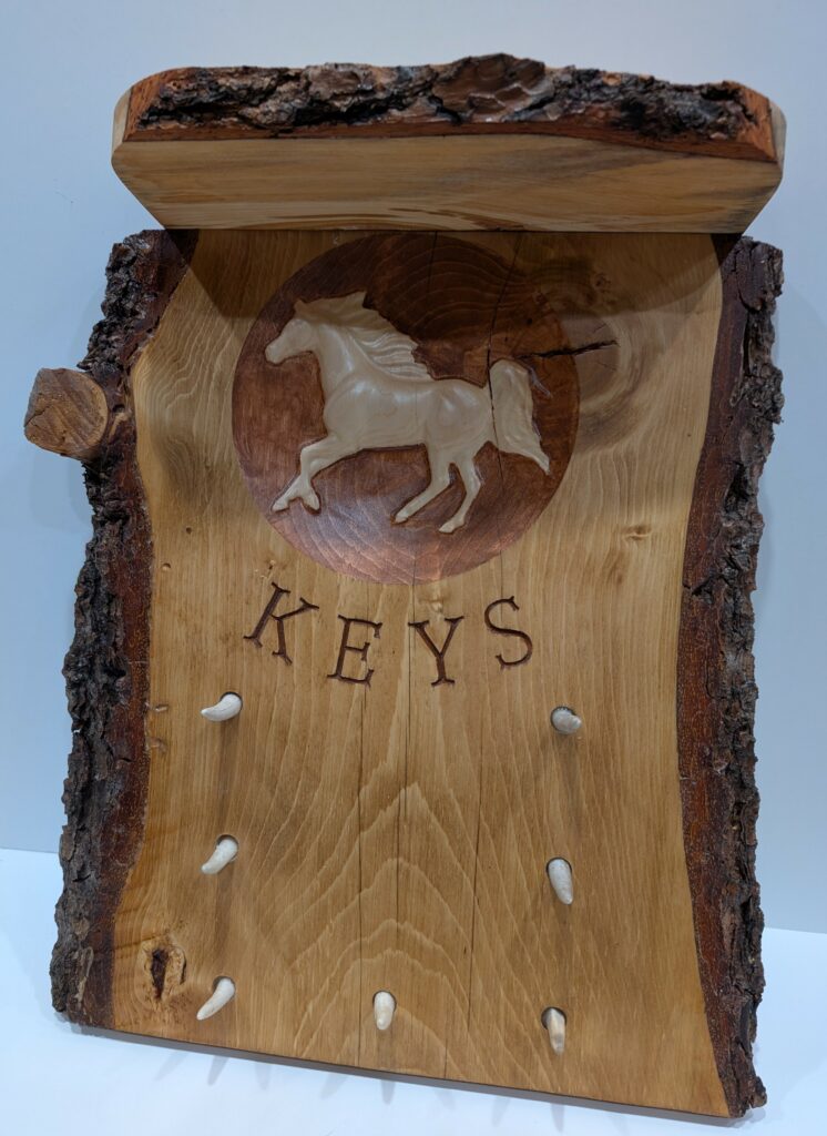 SPRUCE KEY RACK – 11/2025 – I was commissioned to make this Key Rack by a friend who gave it as a Christmas gift. The carving of the horse and the lettering were done on the CNC Router. Made from a live edge spruce slab, it features 6 key hooks and a purse hook centered at the bottom.