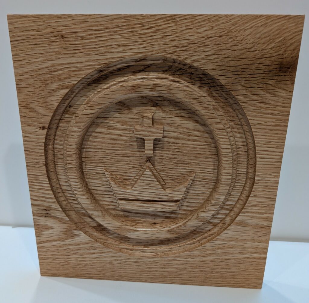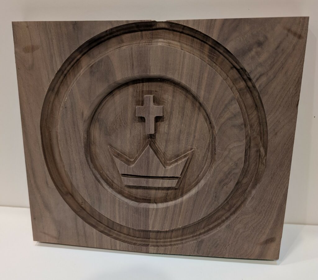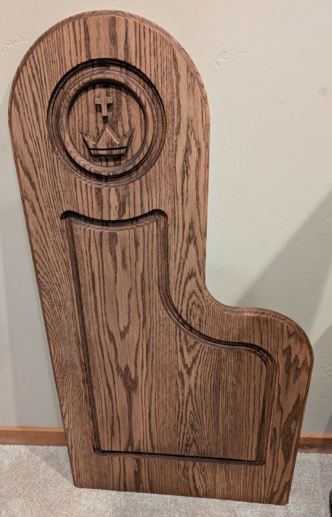 RED OAK PEW ENDS– 011/25 – My local church, Christ the King Parish in Missoula, is remodeling the worship space in the Church. I was asked to produce ninety new pew ends to replace the existing 70’s era modern looking pew ends. The design includes a carving of the Parish Seal, a Cross and Crown motif. I have acquired a CNC Router to help make the carvings. After watching many tutorial videos, I have gained at least enough skill to create the “toolpaths” necessary to make al the cuts on this pew end including the overall cut-out.