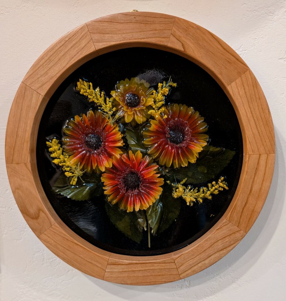 ROUND FRAMED FLOWERS – 10/25 – I was commissioned by a friend to make this wall decor piece as a Christmas gift for his wife.