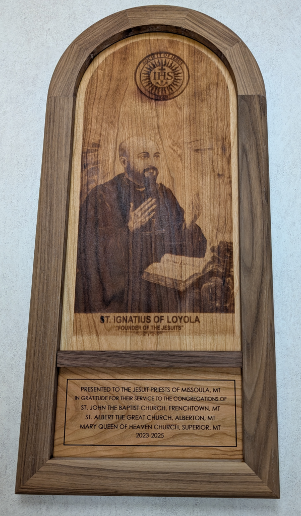 ST. IGNATIUS WALL PLAQUE – 3/25 – I made this wall plaque as a gift to the Jesuit Priests of Missoula in gratitude for their two years of service to my parish, St. John the Baptist, in Frenchtown, MT. St. Ignatius of Loyola was the founder of the Jesuit Order of Priests.